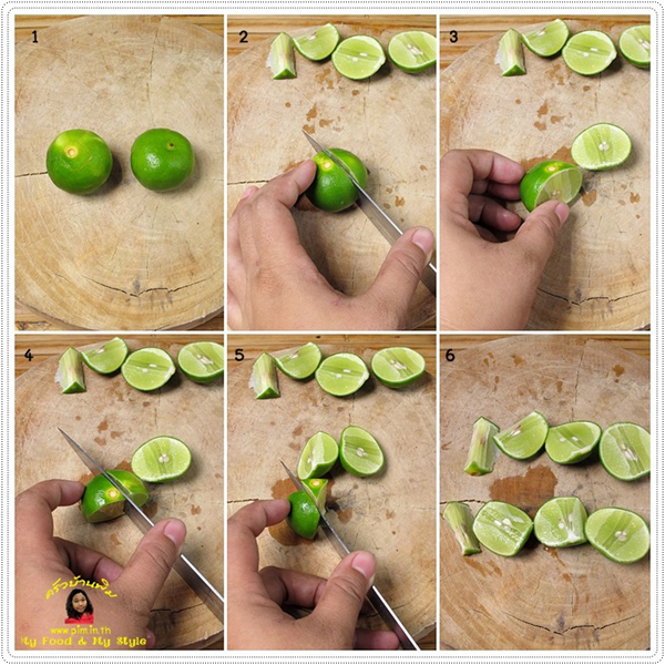 5. ส่วนมะนาวนำไปล้างทั้งลูกให้สะอาด ซับด้วยผ้าให้แห้ง หั่นไว้เป็นชิ้น ๆ แล้วคั้นเป็นน้ำมะนาวให้ได้ประมาณ 3 ช้อนโต๊ะ นะคะ