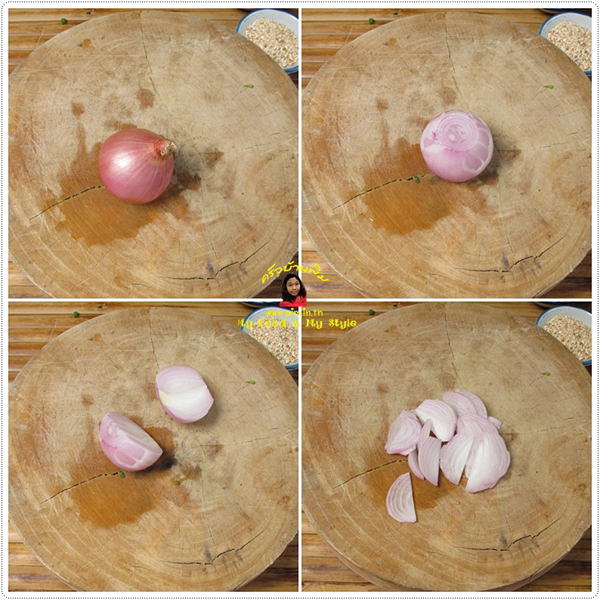 4. หอมแขก มีลักษณะแบบเดียวกันกับหอมแดงนะคะ แต่หัวโตกว่า (หรือเพื่อน ๆ จะใช้หอมแดงก็ได้ค่ะ) ก็ให้เราเอาหอมมาปอกเปลือก แล้วซอยบาง ๆ ไว้ค่ะ