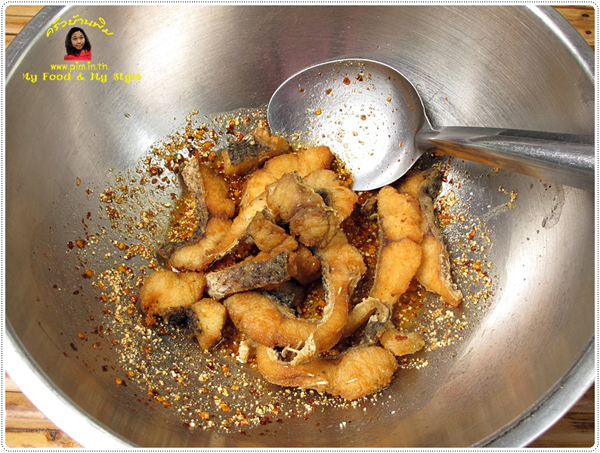 8. แล้วก็ใส่เนื้อปลากะพงทอดลงไป