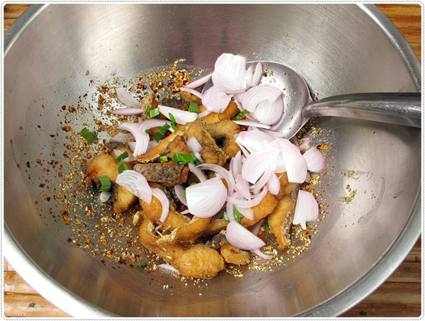 พอได้เนื้อปลา และเราทำความสะอาดเรียบร้อยแล้ว ก็ให้เราหั่นเนื้อปลาเป็นชิ้น หนาสัก 1 เซนติเมตร ส่วนความกว้างยาวแล้วแต่ชอบ แต่ให้กะว่าพอคำ อย่าใหญ่เกิน อย่าเล็กเกิน แล้วนำไปเคล้าเกลือ พักไว้สักแป๊บ ก็นำไปทอดให้เหลืองกรอบทั่วทั้งชิ้นค่ะ ซึ่งตรงส่วนนี้พิมไม่ได้ถ่ายรูปมาฝาก เพราะว่าพิมทำอย่างอื่นไปด้วย แต่คิดว่าเพื่อน ๆ น่าจะเข้าใจได้ไม่ยากนะคะ