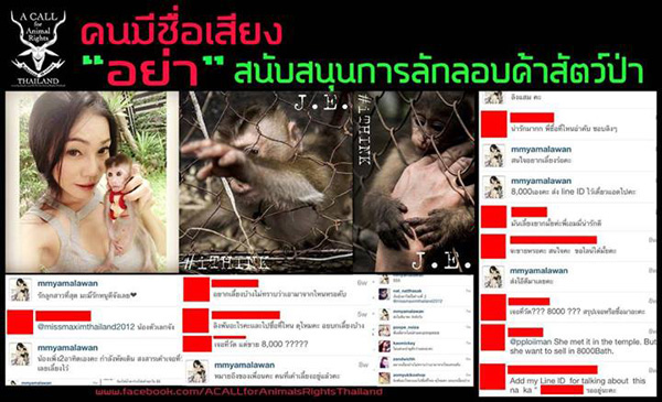 A CALL >> คุณเป็นบุคคลมีชื่อเสียง เป็นบุคคลสาธารณะ ที่มีคนติดตามร่วม 17K ใน Instagram การที่คุณโพสต์รูปสัตว์ป่าในความดูแลของคุณ จับใส่เสื้อผ้า เลี้ยงดูเป็นสัตว์เลี้ยง คุณรู้หรือไม่ว่าการกระทำของคุณ ส่งผลกระทบเพียงไหน มันเป็นการสนับสนุนให้คนที่ติดตาม สนใจอยากจะเลี้ยงบ้าง อย่างที่เค้ามาคอมเม้นท์ และนั่นไม่ใช่ "สัตว์เลี้ยง" มันคือ "สัตว์ป่า" .... ไม่เพียงเท่านั้น คุณเสนอขายลิงแสมสัตว์ป่าคุ้มครองให้บรรดาแฟน ๆ ที่สนใจอีก
