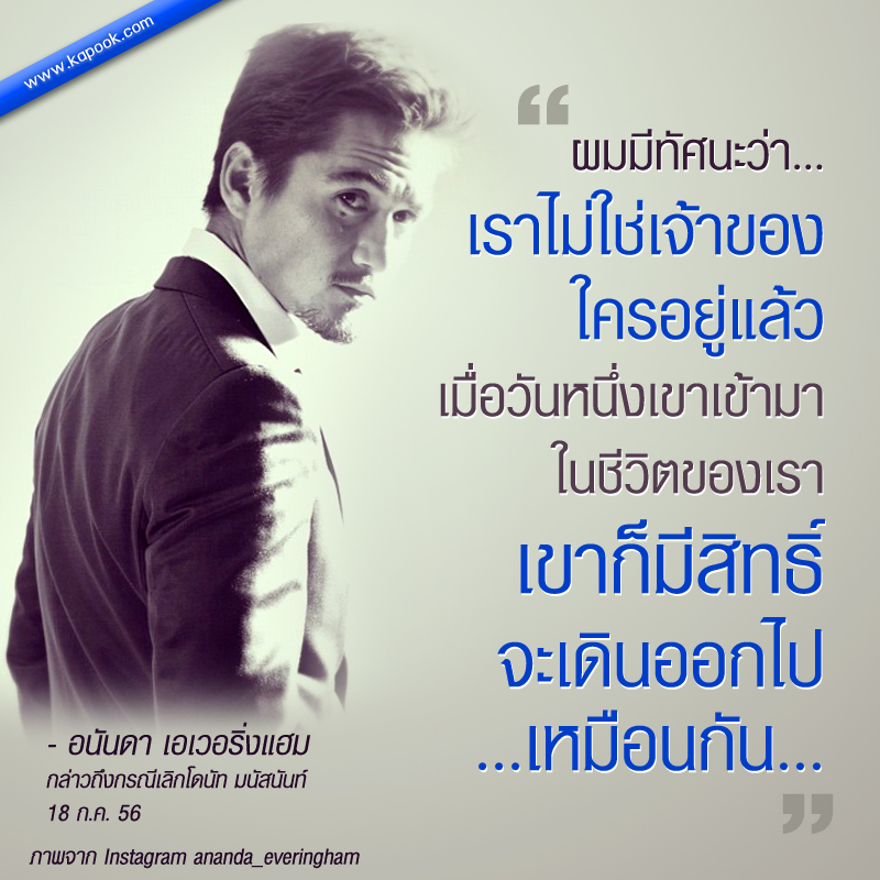 เมื่อถามว่าตอนนี้ห่างกันมานานหรือยัง อนันดา ก็ตอบว่า เรื่องห่างก็คงไม่ได้ห่างอะไรมากมาย เขาก็ยังอยู่ในชีวิตผมนั่นแหละ แต่เพียงแค่ว่าตอนนี้เราคบกันในอีกสถานะหนึ่ง พูดตรง ๆ ผมเองก็ไม่ใช่คนที่คบใครง่ายสักเท่าไร อาจจะเป็นเพราะสิ่งที่ต้องรับผิดชอบอะไรหลาย ๆ อย่าง ก็เลยยังไม่พร้อมที่จะดูแลใคร เราจะคุยกันอีกแบบหนึ่งมากกว่า ส่วนเรื่องอนาคตเราก็เคยคุย แต่ไม่ได้มาชี้แจงว่าต้องเป็นอย่างนั้นอย่างนี้ ไปไม่ได้ก็คือไปไม่ได้ ...ผมมีทัศนะว่าเราไม่ใช่เจ้าของใครอยู่แล้ว เมื่อวันหนึ่งเขาเข้ามาในชีวิตของเรา เขาก็มีสิทธิ์จะเดินออกไปเหมือนกัน... โอกาสจะกลับมาเหมือนเดิมก็คงอาจจะ แต่ผมไม่ใช่คนที่คิดว่าอนาคตมันจะระบุได้ว่าจะกลับมาคืนดีกันไหม หรือยังไง ตอนนี้เราก็ยังคุยกัน ส่งข้อความหากันอยู่