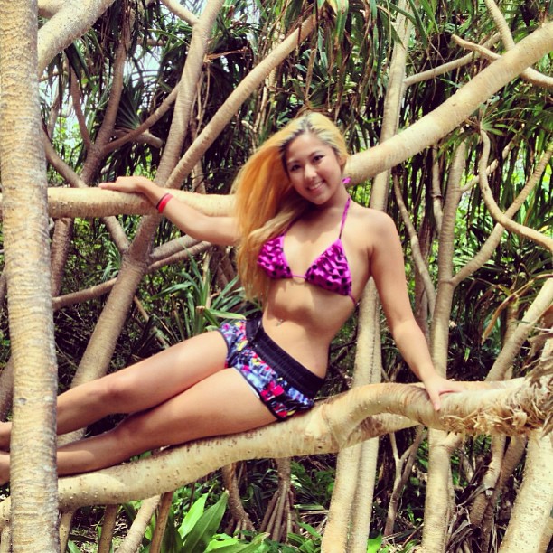 ส่วนท่าโพสนั้น ขอบอกเลยค่ะว่าไม่เหมือนใครเลยจริง ๆ เพราะสาวหวายเล่นปีนป่ายต้นไม้ พร้อมจิกหน้าเก๋ ๆ ให้ได้ชมกันด้วย จะว่าไปลุคสาวหวายผมบลอนด์ผิวสีแทนก็น่ารักสดใสไปอีกแบบนะ