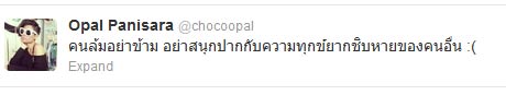 ส่วนทางด้าน โอปอล์ ปณิสรา @chocoopal ทวีตว่า คนล้มอย่าข้าม อย่าสนุกปากกับความทุกข์ยากชิบหายของคนอื่น :(