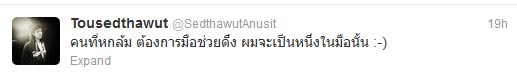 เช่นเดียวกันกับ ตั้ว เสฎฐวุฒิ อนุสิทธิ์ นักแสดงในเรื่องที่รับบทเป็นธีร์ ก็ได้โพสต์ข้อความว่า.. คนที่หกล้ม ต้องการมือช่วยดึง ผมจะเป็นหนึ่งในมือนั้น :)