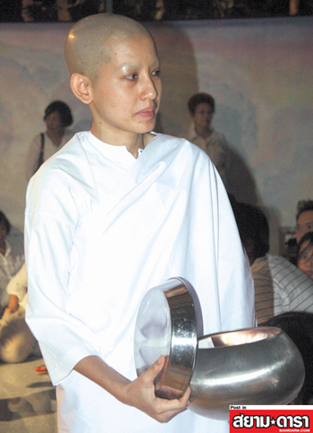 \'\'ตอนที่กลับจากภูเก็ต ประมาณวันที่ 20 ก.ย. ระหว่างอยู่บนเครื่องบิน อ้อมเค้าก็ถามแม่ว่า อ้อมจะบวชได้มั้ยเค้าอยากเรียนรู้ให้ลึกซึ้ง ซึ่งแม่ว่าจิตใจของอ้อมนั้นเค้ามีพื้นฐานเรื่องธรรมมะและเป็นเด็กดีอยู่แล้ว และอ้อมจะบวช 3 อาทิตย์ ก็จะมีอยู่ที่นี่ด้วย และจะไปปลีกวิเวกการบวชก็จะถือศีล 10 ก็มีการทำวินัยของผู้บวชใหม่ อ้อมจะต้องออกบิณฑบาตทุกเช้าเวลาประมาณ 6 โมง ซึ่งก็จะทำให้อ้อมได้รู้ในอีกแง่มุมของการบวช และอีกอย่างช่วงนี้ก็เป็นวันเกิดของคุณแม่อ้อมด้วยก็เป็นช่วงที่ดีที่อ้อมจะบวช และแม่คิดว่าในวันเกิดคุณแม่ของอ้อมเองก็ออยากจะให้อ้อมแสดงธรรมให้คุณแม่อ้อมฟัง ซึ่งคงจะทำให้คุณแม่อ้อมสุขใจมาก\'\'