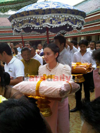 จากนั้นผู้สื่อข่าวได้ถามถึงเรื่อง \'\'ถือหมอน\'\' ในวันนี้ นางเอกสาวบอกว่า ตนก็ไม่ทราบล่วงหน้ามาก่อน สำหรับตนจะได้ถือหรือเปล่าไม่สำคัญ แต่ได้มาอนุโมทนาบุญก็อิ่มใจแล้ว