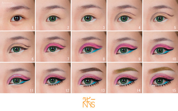 (9-10) ลง Eyeliner อีกครั้งให้คมชัดและลากหางยาวออกไป รวมถึงร่างเส้นที่ขอบตาล่าง เพื่อเป็นไกด์สำหรับการติดขนตาล่าง