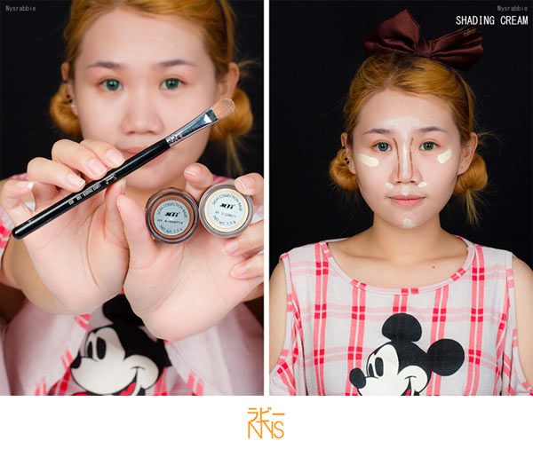 จากนั้นเราก็จะเริ่มศัลยกรรมกัน เนื่องจากหน้านัทมองจาก 45 องศาเป็นต้นไปจะแลดูมีดั้ง แต่พอหน้าตรงเท่านั้น แบนและบานครบค่ะ...ใช้ MTI : Sign Collection Base สีขาว #W1 สำหรับงัดดั้ง หน้าผาก คาง และใช้ #N7 ตบส่วนเกินลงไปค่ะ