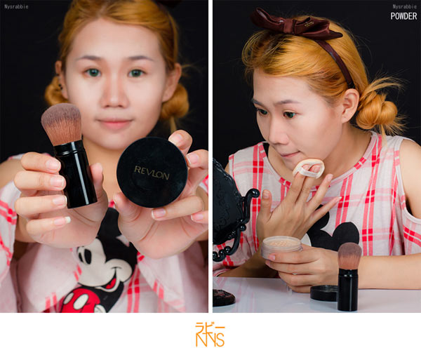 ลงแป้งฝุ่น REVLON : Touch & Glow Extra Moisturizing Face Powder Translucent #2 โดยใช้พัฟในตลับแตะ ๆ ให้ทั่วหน้า จากนั้นใช้แปรงคาบูกิ (จากตลาดนัด) มาปัดวนเพื่อกำจัดผงแป้งส่วนเกินออก
