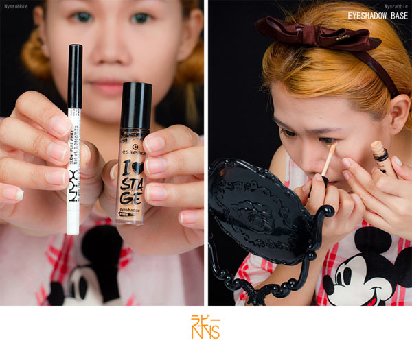 (3) ลง ESSENCE: I Love Stage Eyeshadow Base ทั่วตาบนและล่าง และใช้ NYX: Slide On Pencil #04 Pure White ลงที่หางตาล่าง