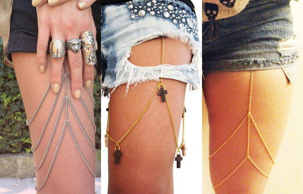 แฟชั่นมีอะไรใหม่ ๆ มาให้เราแปลกใจได้ทุกครั้งจริง ๆ อย่าง Leg Chain หรือสร้อยขา ที่มองดูคราวแรกยังนึกฉงน ว่านี่เอาสร้อยคอมาใช้ผิดจุดประสงค์หรือเปล่าหว่า แต่ไม่ใช่จ้า อันนี้เป็นแฟชั่นใหม่จริง ๆ นะ เป็นแอคเซสซอรี่สำหรับประดับเรียวขา ใครขายาวน่าจะลองดูนะ เอาไว้ใส่กับยีนส์ เลกกิ้ง ถุงน่อง หรือว่าจะใส่กับกางเกงขาสั้นก็เวิร์คอยู่นะเออ