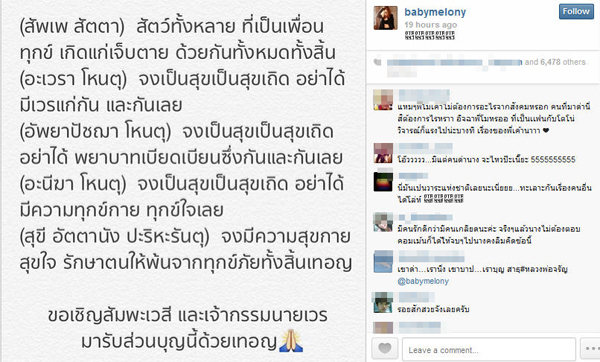 ด้านชาวเน็ตก็ได้โพสต์แอนตี้แตงโมอีกระลอก เพราะไม่พอใจกับพฤติกรรมที่ตรงเกินไปของสาวแตงโม แต่สาวเจ้าดูท่าจะไม่สนใจ เพราะล่าสุดโพสต์บทสวดแผ่เมตตา ขอให้สัมภเวสีเจ้ากรรมนายเวรมารับส่วนบุญส่วนกุศล (ทั้ง ๆ ที่เธอนับถือศาสนาคริสต์) เอ้า ! ไม่รู้ว่าสาวโมเปลี่ยนศาสนาตั้งแต่เมื่อไร แล้วบทสวดมนต์นั้นสื่อถึงใครหรือเปล่าก็ไม่รู้ รู้แต่ว่าเรื่องนี้อ่ะ จบยากชัวร์ ๆ
