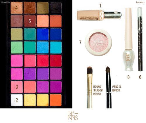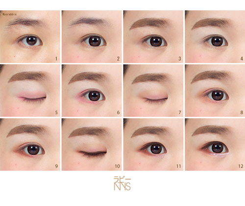 (5-6) ใช้แปรงตาแบบแบน แตะสีชมพู #3 ทาที่เปลือกตาด้านในรอยพับทั้งหมด รวมถึงหางตาล่างมาถึงกลางตาล่าง