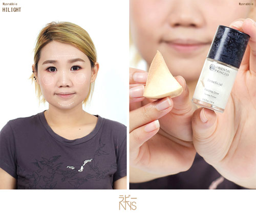 บีบ Primer ออกมาเท่าเมล็ดข้าวโพดค่ะ แล้วก็เกลี่ยแก้ม หน้าผาก คาง ถ้าเหลือก็ทาดั้งค่ะ
