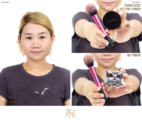 แล้วใช้แปรงเดิมกับแป้ง MISTINE: Ribbon BB Powder: S1 ปัดให้ทั่วเพื่องานเนียน งานแน่น