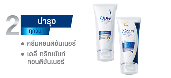 ขั้นตอนที่ 2 บำรุงเส้นผมทุกวัน ด้วย โดฟ อินเทนซ์ รีแพร์ คอนดิชันเนอร์ ที่เคลือบปิดเกล็ดผมช่วยป้องกันการแห้งแตกปลาย พร้อมเสริมสร้างความยืดหยุ่นให้เส้นผมแข็งแรงและมีน้ำหนัก สำหรับวิธีใช้ก็เพียงแค่นำมาชโลมบริเวณกึ่งกลางของเส้นผมจรดปลายทิ้งไว้ 1-3 นาทีแล้วล้างออก เท่านี้ก็เตรียมสัมผัสผมนุ่มสลวยได้เลย แต่สำหรับสาว ๆ คนไหนที่มีผมแห้งเสียมาก ต้องลอง