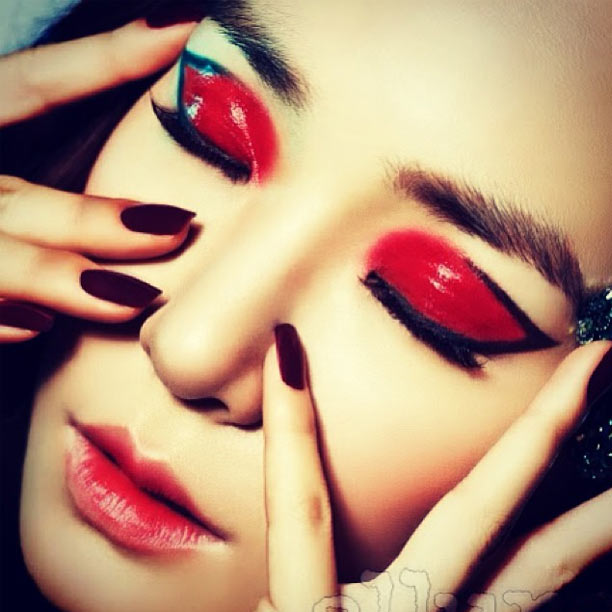 มาสร้างมิติให้ดวงตาดูเก๋เริดแบบแฟนตาซี ด้วยอายไลเนอร์ครีมสีแดงสดเกลี่ยให้ทั่วเปลือกตา จากนั้นจึงลากใช้อายไลเนอร์สีดำเขียนล้อมกรอบอายแชโดว์ไว้ แล้วอย่าลืมตวัดหางช่วงปลายให้คมด้วยนะ เก๋เว่อร์..