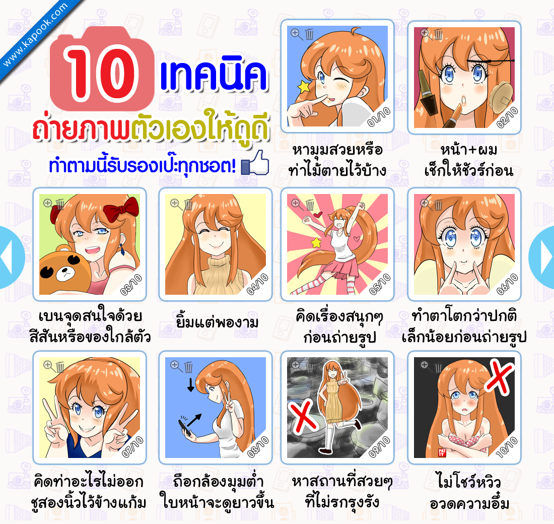 เรียบเรียงข้อมูลโดยกระปุกดอทคอม ต้องบอกว่าการถ่ายรูปลงบนโซเชียลเน็ตเวิร์กในยุคนี้กลายเป็นกิจกรรมสำคัญในชีวิตประจำวันของทุกคนไปเสียแล้ว ไม่ว่าจะเป็นตอนตื่นนอน ตอนบ่าย ตอนเย็น หรือก่อนนอน ก็เรียกได้ว่าหลายคนต่างง่วนอยู่กับการหามุมแชะภาพเพื่อโชว์รูปสวย ๆ ผ่านสื่อ หรือเป็นการอัพเดทตัวเองในเพื่อน ๆ ได้รับรู้และติดตามความเคลื่อนไหว ยิ่งในช่วงหลัง ๆ มานี้เทรนด์การถ่ายรูปตัวเองสไตล์ Selfie กำลังมาแรง วันนี้เราเลยขอนำ 10 ทริคเล็ก ๆ เกี่ยวกับการถ่ายรูปตัวเองให้ดูดีมาฝากกัน ใครยังเขิน ๆ คิดไม่ออกว่าจะเก๊ก หรือแอ๊บท่าไหนให้สวยถูกใจ ห้ามพลาดโดยเด็ดขาดจ้า...
