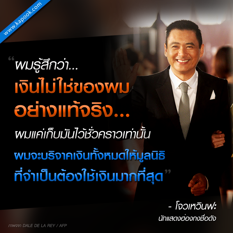 เมื่อวันที่ 17 กุมภาพันธ์ 2557 เว็บไซต์ shanghaiist.com รายงานว่า โจวเหวินฟะ นักแสดงฮ่องกงชื่อดัง วัย 58 ปี ประกาศยกสมบัติได้มาจากการทำงาน 1 พันล้านดอลลาร์ฮ่องกง (ราว 5,248 ล้านบาท) ให้กับองค์กรการกุศลภายหลังจากที่เขาเสียชีวิตไปแล้ว
