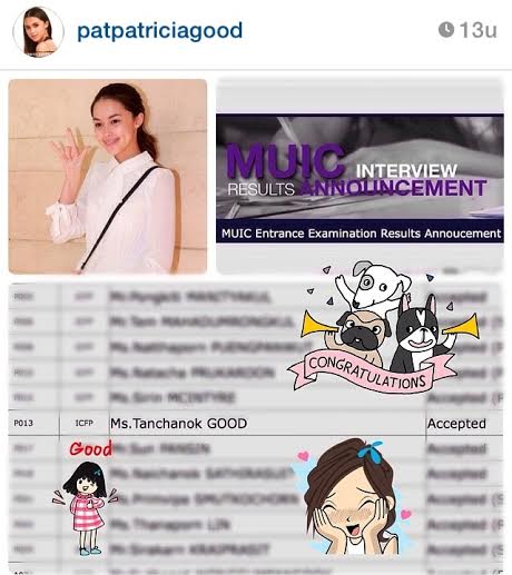 ขอแสดงความยินดีด้วยจ้า กับแพทริเซีย กู๊ด นักแสดงสาวของช่อง 3 ที่สอบติดคณะดังจาก 3 มหาวิทยาลัย ทั้งจุฬาลงกรณ์มหาวิทยาลัย, มหาวิทยาลัยธรรมศาสตร์, และมหาวิทยาลัยมหิดล ทั้งที่น้องแพทริเซีย กู๊ด เอง เพิ่งอายุเพียง 16 ปีเท่านั้น เก่งสุด ๆ ไปเลย