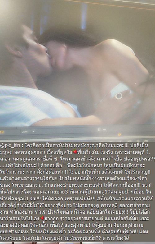 "@ple_irin : ใครคิดว่าเป็นการโปรโมทหนังกรุ ณาคิดใหม่นะคะ ปกติเป็นมนุษย์อดทนสุด ๆ แล้ว เรื่องที่พูดไม่ที่เหวี่ ยงโมโหจริง เพราะสาเหตุที่ 1. เมื่อวานคนดูแลดาราชื่อพี่ ช. โทรมาแต่เช้าจริง ถามว่า \'เปิ้ลปล่อยรูปเหรอ เขาไม่พอใจนะ\' คำตอบคือ \'พี่คะ อะไรกันนักหนา หนูเป็นผู้หญิงน่าจะโมโหกว่านะ ผู้กำกับสั่งก็ต้องทำ ไม่อยากให้เห็นแล้วเล่นทำไม รำคาญ!! แล้วต่างคนต่างวางหูใส่กัน โปรโมทหนังมั้ย??? สาเหตุต้องเหวี่ยง 2 พีอาร์กองโทรมาบอกว่า \'นักแสดงชายทะเลาะกับแฟน ให้ตัดฉากนี้ออก!!! เหรอ ! ฉันไปกอง 7 โมง นอนรอถ่ายบ่าย 3 ทีมงานผู้ชายรุมดู 10 คน จูบปากเปื่อย ในบ้านร้อน ๆ อยู่ 1 ชั่วโมง ให้ตัดออกเพราะแฟนหึง!! สปิริตนักแสดงและการให้เกียรติ ผู้กำกับมีมั้ย??? อยากรู้จริงเปล่า ไปถามกองดู สาเหตุ 3 ออกมาก้าวก่ายงาน ทำกองป่วน ทำเราป่วนไม่พอ หน้าจอแอ๊บบอกไม่เคยยุ่ง!!! โบ้ยใส่อีกหาว่าเรามโนไปเองมาก รู้ว่าอยู่วงการมายาแต่แมนหน่ อยได้มั้ย เยอะละมาสลัดหอกให้คนอื่น เพื่อ?? และสุดท้าย ! ให้จูบปาก จับนมกูทำไม !!ฉันอะนะ โดนเหวี่ยงแต่เช้า จะตัดผลงานทิ้ง ต้องจูบกับผู้ชาย!! แถมโดนจับนม โดนโบ้ย โดนรุมด่า โปรโมทหนังมั้ย?? ควรเหวี่ยงได้ยัง????!!!!??"