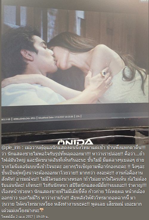 "@ple_irin : เมื่อวานผู้ดูแลนักแสดงคนหนึ่ งโทรมาแต่เช้า ฉันเพิ่งแหกตาตื่น !!! ว่านักแสดงชายไม่พอใจกับรูปที่ หลุดออกมา !!! หาว่าเราปล่อย !! คือว่าถ้าไฟล์มันใหญ่ และชัดขนาดอันที่เห็นกันอะนะ ฉันไม่มี มีแต่ราง ๆ เบลอ ๆ ถ่ายจากมอนิเตอร์แบบนี้เข้ าใจนะคะ อยากรู้อะไรเชิญถามพีอาร์ กองนะคะ จริง ๆ แล้ว ฉันเป็นผู้หญิงน่าจะต้ องออกมาโวยวายมากกว่า งงอ่ะค่ะ !! งานก็คืองาน สั่งคัท ! อารมณ์จบ !! ไม่มีใครแย่งนางหรอก ถ้าไม่อยากให้ใครเห็น ก็ไม่ต้องรับเล่นสิคะ ! เก็ทนะ !! อะไรกันนักหนา สปิริตนักแสดงมีมั้ย !! จบเถอะ !! รำคาญ !!! เรื่องหน้าช่วยหานักแสดงชายที่ ไม่มีเมียขี้หึง ก้าวก่าย ไร้เหตุผล หน้ากล้อง ออกข่าว บอกไม่มีอะไร หาว่าเรามโน !! ลับหลังให้ผัวโทรมาถอดฉากนี้ มาวุ่นวาย ให้คนโทรมาเหวี่ยง หลังทำงานนะคะ !! พูดเลย เสียอารมณ์ เยอะมากเดี๋ยวแม่เหวี่ยงมั่งนะ"