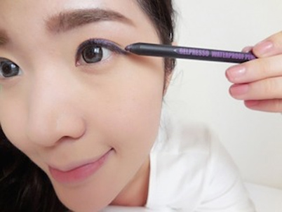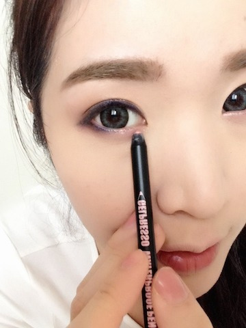 ใช้อายไลน์เนอร์สีม่วงวิ้ง ๆ จาก CLIO วาดให้ชิดขอบตา เพื่อให้ตากลมโต