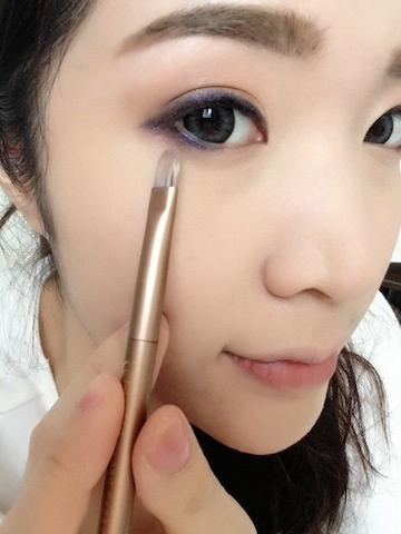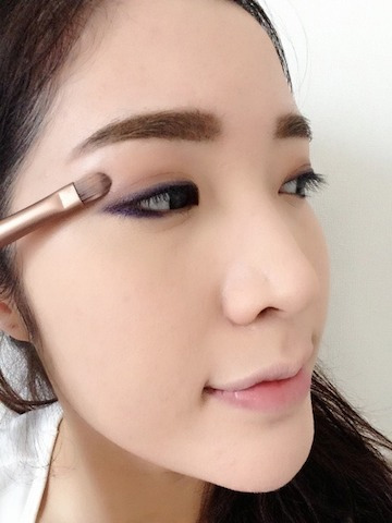 ทาอายแชโดว์ NAKED 3 สี Trickให้ทั่วเปลือกตา และเน้นหางตาด้วยสี Factory จากนั้นเบลนด์สีให้กลืนกันดูเป็นธรรมชาติ จากนั้นนำอายไลน์เนอร์สีม่วงมาวาดขอบตาล่างตวัดให้เป็น Cat Eye เล็กน้อย เพิ่มความเฉี่ยวเปรี้ยวให้แก่ดวงตา
