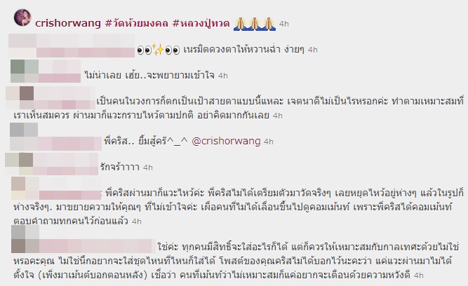 โดยความคิดเห็นส่วนใหญ่จากชาว IG มองว่า ชุดที่สาว คริส หอวัง ใส่ เป็นชุดที่ไม่เหมาะสมและไม่เคารพสถานที่ ดูแล้วไม่งาม หรือหากจะแวะไหว้พระ ก็ไม่ควรโพสต์รูปตัวเองขณะแต่งตัวแบบนี้ลงโซเชียล ในขณะที่บางส่วนก็มองว่า ไม่ควรตำหนิสาว คริส หอวัง มากนัก เพราะเจ้าตัวแค่ผ่านมาเฉย ๆ ไม่ได้ตั้งใจมาที่วัดแต่แรก จึงอาจไม่ได้แต่งตัวเรียบร้อยมา และเมื่อแวะไหว้พระ เธอก็เลือกที่จะยืนไหว้อยู่ไกล ๆ ไม่ได้เข้าใกล้สถานที่สักการะหลวงปู่ทวดแต่อย่างใด