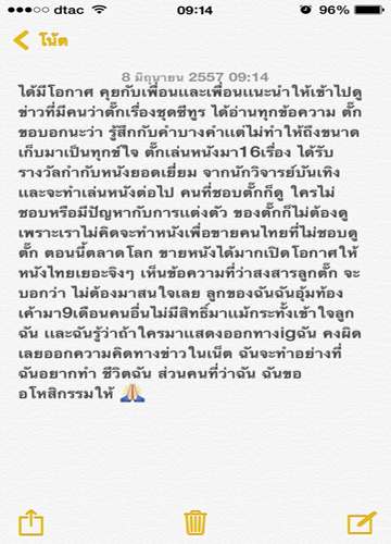 จริง ๆ เห็นข้อความที่ว่า สงสารลูกตั๊ก จะบอกว่า ไม่ต้องมาสนใจเลย ลูกของฉัน ฉันอุ้มท้องเขามา 9 เดือน คนอื่นไม่มีสิทธิ์มาแม้กระทั่งเข้าใจลูกฉัน และฉันรู้ว่าถ้าใครมาแสดงออกทาง IG ฉัน คงผิด เลยออกความคิดทางข่าวในเน็ต ฉันจะทำอย่างที่ฉันอยากทำ ชีวิตฉัน ส่วนคนที่ว่าฉัน ฉันขออโหสิกรรมให้"