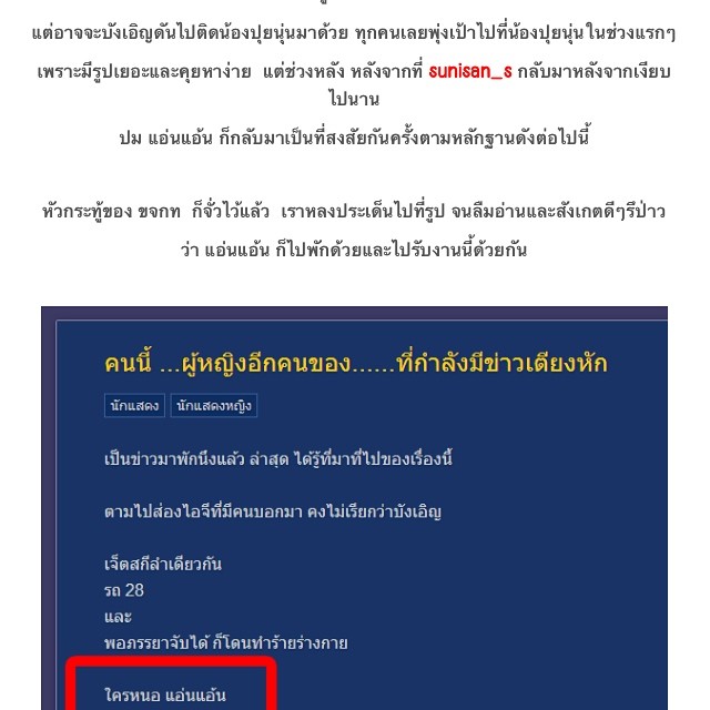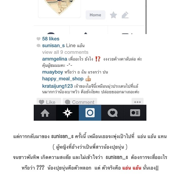 ทั้งนี้ อินสตาแกรมที่ชื่อว่า sunisan_s ได้ออกมาโพสต์ภาพของ แอ่นแอ้น ที่สวมชุดแข่งรถเหมือนของ เอ๋ ชนม์สวัสดิ์ พร้อมกับจูบถ้วยรางวัล และยังมีข้อความว่า "คุณแอ้นจูบถ้วยรางวัลแล้วใส่ชุดวัฒนา ชุดรถแข่งของคุณเอ๋ ^^" และยังมีการลงชื่อ Line ของ แอ่นแอ้น เพื่อหวังให้มีคนแอดไปโจมตี ซึ่งภายหลังทำให้ทราบว่า แอ่นแอ้น นั้น รู้จักกับปุยนุ่น เพราะปุยนุ่นเคยลงภาพคู่กันกับ แอ่นแอ้น และลงข้อความว่า "แฝดจ๋าฉันคิดถึงเธอ"