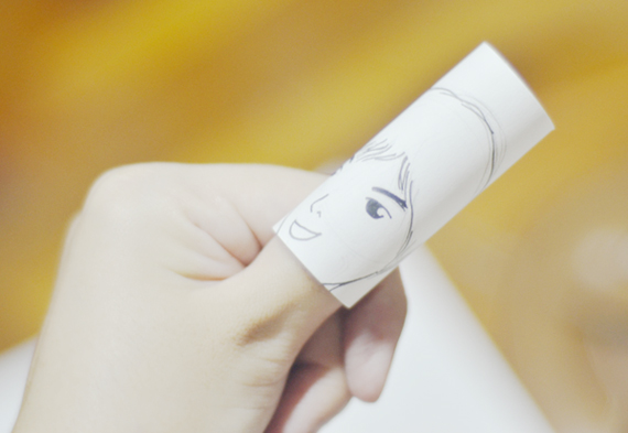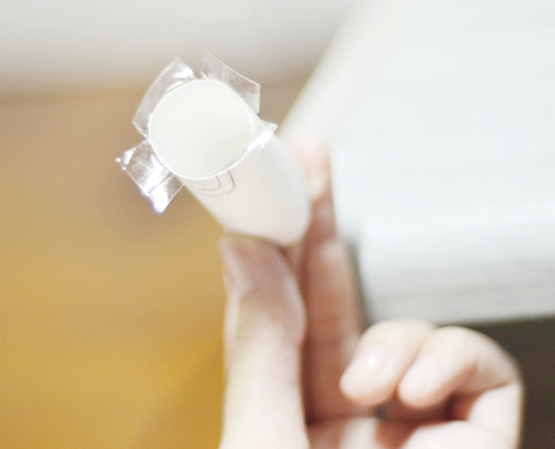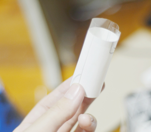 5. นำกระดาษแข็ง ตัดความสูงให้ได้ประมาณหลอดลิปมัน ความกว้างประมาณ พันรอบนิ้วโป้งไว้หลวม ๆ แบบในภาพได้ขนาดพอเหมาะแล้วก็แปะกาวสองหน้า ให้ม้วนเหมือนทองม้วน