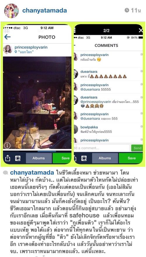 ด้านสาวชัญญ่าก็ขอแคปเจอร์ภาพพร้อมข้อความที่สาวดิวคอมเมนต์ ระบุว่า... "ในชีวิตเลี้ยงหมา ช่วยหมามา โดนหมาไล่บ้าง กัดบ้าง แต่ไม่เคยมีหมาตัวไหนกัดไม่ปล่อยเท่าเธอคนนี้จริง ๆ กัดตั้งแต่ตอนเป็นเพื่อนกัน (เออไม่สิมันบอกว่าเราไม่เคยเป็นเพื่อนกัน) จนเลิกคบกัน จนทะเลาะกัน จนผ่านมานานแล้ว มันก็ยังคงกัดอยู่ เป็นอะไร ? คันฟัน ?