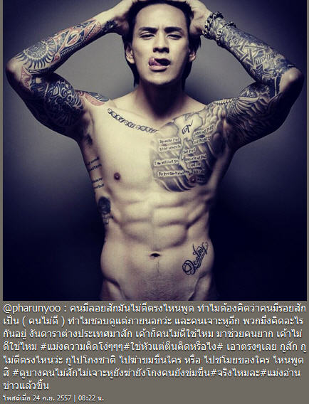 ล่าสุดวันนี้ (24 กันยายน 2557) หนุ่มที่มีรอยสักอย่าง แทค ภรัณยู ถึงขั้นของขึ้นเลยทีเดียวหลังได้ยินข่าวดังกล่าว เจ้าตัวเลยโพสต์ภาพของตัวเองที่มีรอยสักทั่วตัวลงอินสตาแกรม พร้อมข้อความว่า "คนมีรอยสักมันไม่ดีตรงไหนพูด ทำไมต้องคิดว่าคนมีรอยสักเป็น (คนไม่ดี) ทำไมชอบดูแต่ภายนอกวะ และคนเจาะหูอีก พวก_คิดอะไรกันอยู่ งั้นดาราต่างประเทศมาสัก เค้าก็คนไม่ดีใช่ไหม มาช่วยคนยาก เค้าไม่ดีใช่ไหม #แม่งความคิดโง่ ๆ ๆ ๆ #ใช้หัวแต่ตีนคิดหรือไง #เอาตรง ๆ เลย _สัก _ไม่ดีตรงไหนวะ _ไปโกงชาติ ไปฆ่าข่มขืนใคร หรือไปขโมยของใคร ไหนพูดสิ #ดูบางคนไม่สักไม่เจาะหูยังฆ่ายังโกงคนยังข่มขืน #จริงไหมล่ะ #แม่_อ่านข่าวแล้วขึ้น"